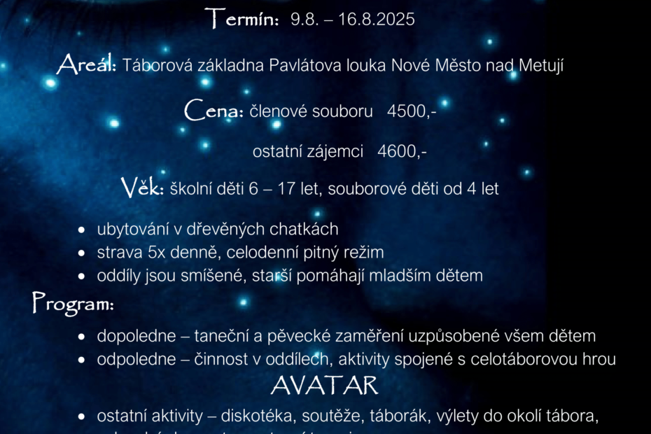 Hlavní základnou pro naše letní dobrodružství bude tentokrát Pavlátova louka u Nového Města nad Metují, děti se mohou těšit na tradiční táborovou náplň, včetně diskotéky, táboráku nebo zahradní slavnosti, ale i nové zážitky spojené s celotáborovou hrou inspirovanou světem filmů Avatar. ![]()